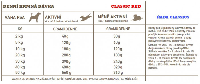 ACANA Classics RED MEAT RECIPE je kompletné krmivo pre psy všetkých vekových kategórií a plemien (okrem psov veľkých plemien v období rastu, ktorí v dospelosti vážia 32 kg a viac). Obsahuje červené mäso z voľného chovu. Má veľmi rozmanité a bohaté zloženie a nízku glykemickú záťaž (neobsahuje vysokoglykemické obilniny). Kvalitné živočíšne proteíny a omega 3 prispievajú k výbornej kondícii psa.