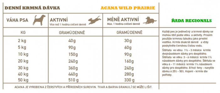 ACANA WILD PRAIRIE RECIPE je kompletné krmivo vhodné pre psy všetkých vekových kategórií a plemien. Granule s nízkym obsahom sacharidov a vysokým obsahom proteínov. Obsahuje mäso z voľne chovaných kurčiat a moriek, vajcia a voľne lovené ryby. Receptúra je úplne bez obilnín.