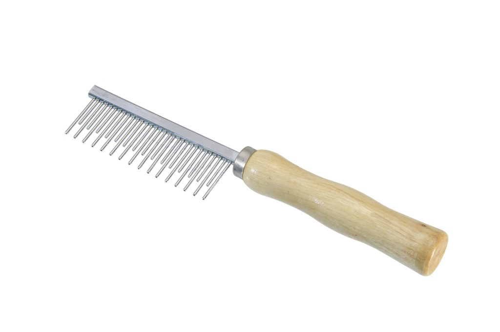 Hrebeň so striedavými zubami s pevnou drevenou rukoväťou, určený pre mokrú srsť..