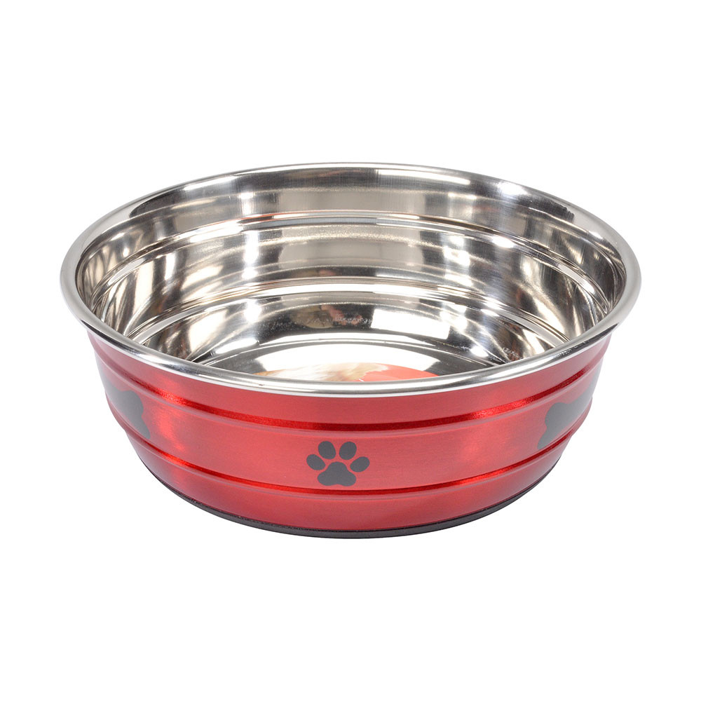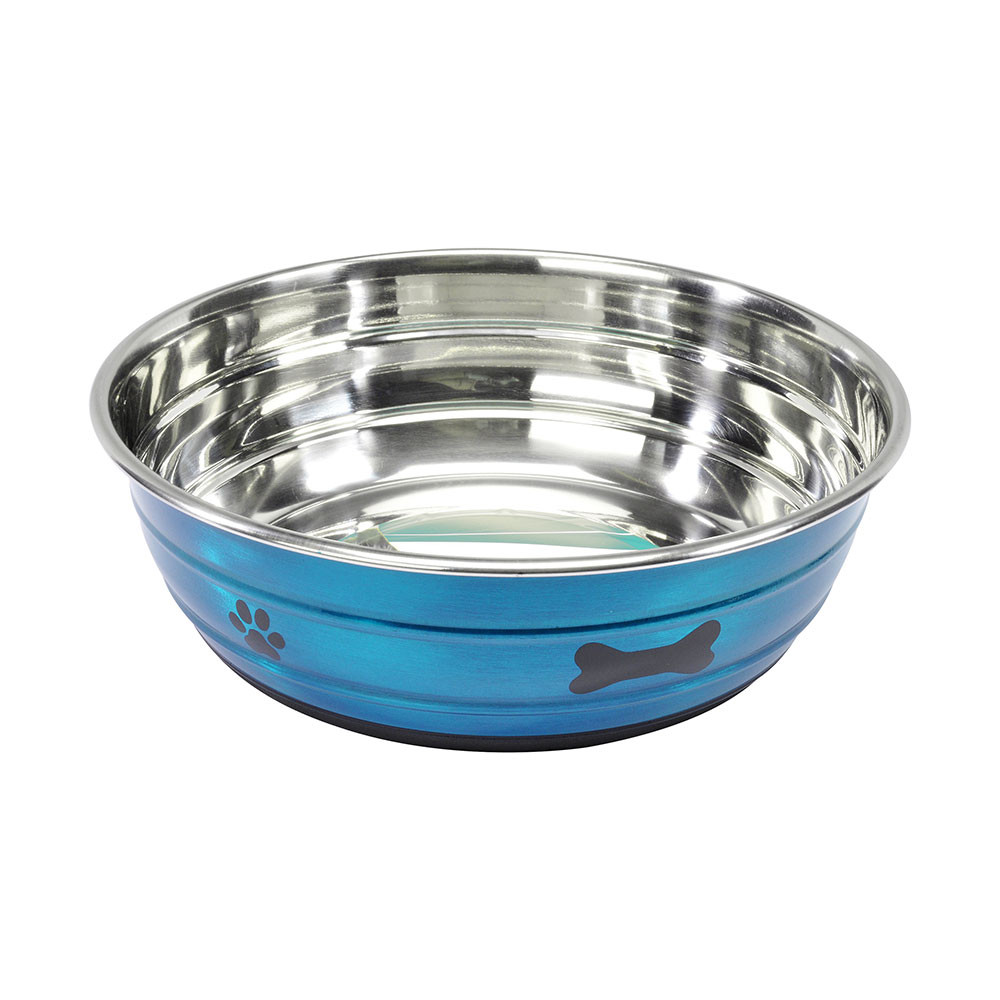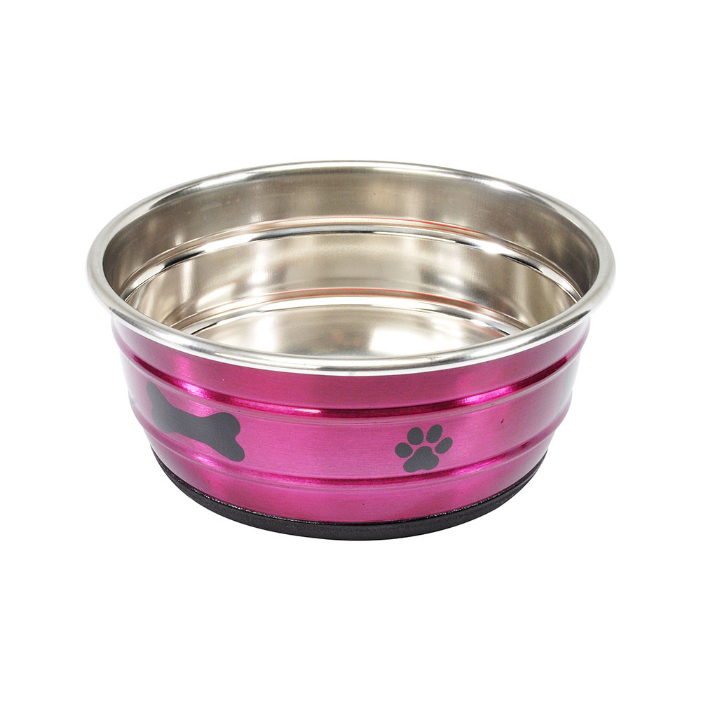 Oceľové misky s protišmykovou a protihlukovou gumou na dne, sfarbené na vonkajšej strane a charakterizované peknými ikonami labky a kosti v strednom vonkajšom páse.