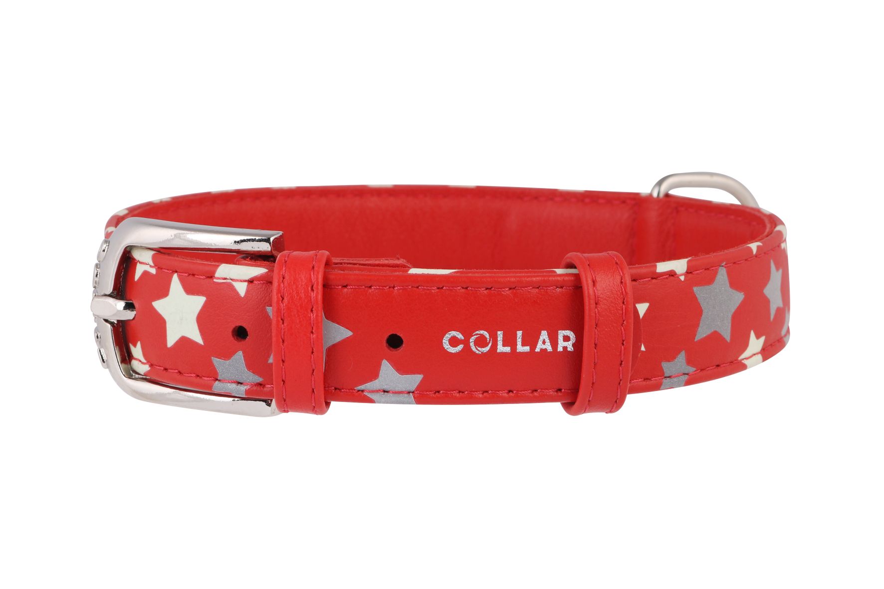 Kožený obojok s hviezdičkami červenej farby z kolekcie CoLLaR GLAMOUR. Kožený obojok je jedinečný tým, že obsahuje kombináciu reflexných a v tme svietiacich - fosforeskujúcich hviezdičiek. Je šitý z dvojitej vrstvy kože. Výrazné pastelové farby zvýraznia Vášho psíka. Produkty značky CoLLar sa vyznačujú veľmi kvalitným a nápaditým spracovaním. Inovatívny rôznorodý dizajn podškrtne charakter Vášho psa a pomôže mu vyniknúť.