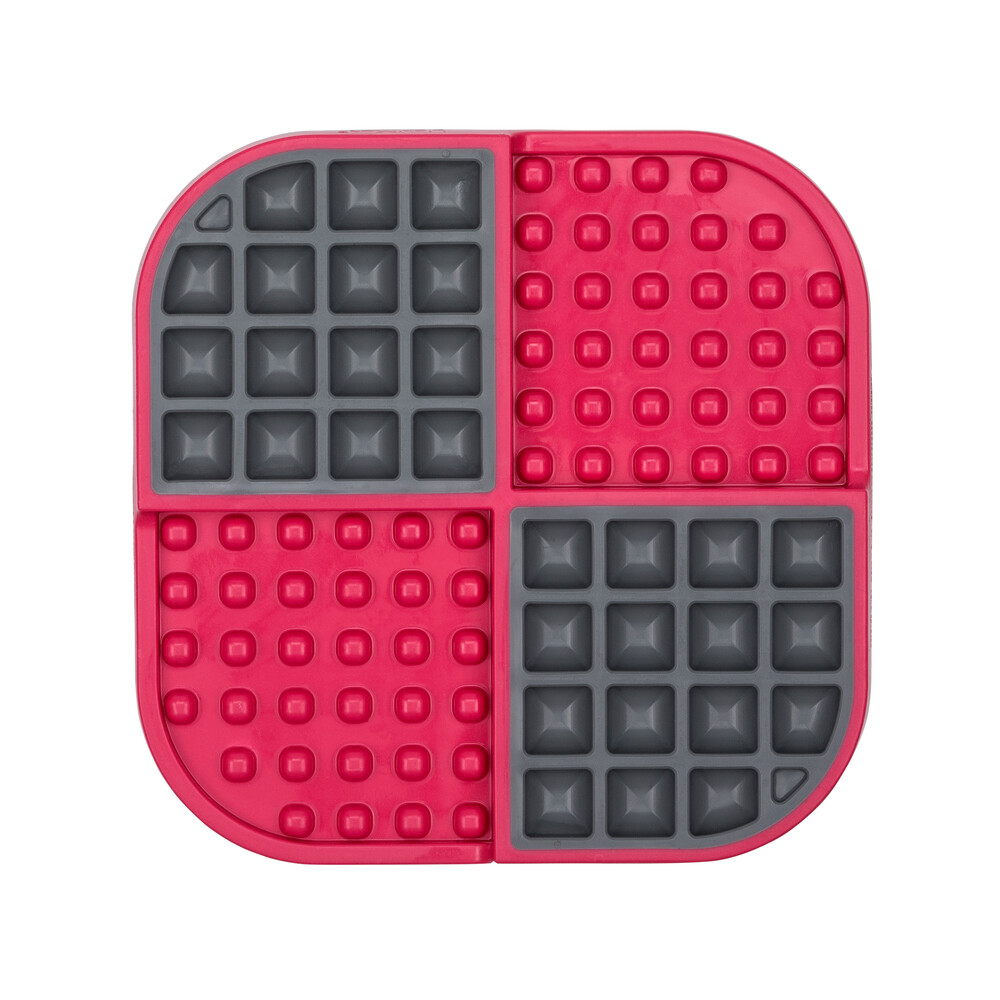 Lízacia plastová podložka Lickimat Slomo, alebo inak slow-feed miska, je rozdelená do štyroch sektorov o rozmeroch 10 x 10 cm. Dva protiľahlé sektory majú vždy rovnaký reliéf. Použité sú dva typy reliéfu – vystúpený a vydutý. Každý sektor môžete naplniť iným druhom pochúťky. Je odporúčaná veterinármi a odborníkmi na správanie psov naprieč celým svetom. LickiMat podložky sú vytvorené s cieľom obohatiť welfare psov a tým zlepšiť ich sústredenie a celkový zdravotný stav. LickiMat tiež zaistí zábavu a zmierni stres u psa, ktorý má sklony k separačnej úzkosti, keď odchádzate z domu. Pomôže tiež v stresujúcich situáciách - napríklad počas búrky alebo dlhého čakania na veterinárne ošetrenie. Rovnako tak bude užitočná pri pobyte psa v klietke. Alebo ju môžete použiť ako dlhotrvajúcu odmenu po pretekoch alebo náročnom výkone. Svoju neoceniteľnú prácu tiež odvedie v prípade psa po operácii, ktorému tak nemôžete dopriať bežnú zábavu vonku. To všetko je pre psa spojené s príjemným zážitkom, kedy si vylizuje mäkkú pochúťku zo všetkých záhybov podložky. Jemné lízanie uvoľňuje endorfíny, ktoré pôsobia upokojujúcim dojmom. Nespornou výhodou je aj to, že psovi umožníte dlhší príjemný zážitok s jedlom, napriek tomu, že použijete pomerne malé množstvo jedla. A navyše k tomu všetkému lízanie podporuje tvorbu slín, čo napomáha čisteniu zubov, ďasien a jazyka.