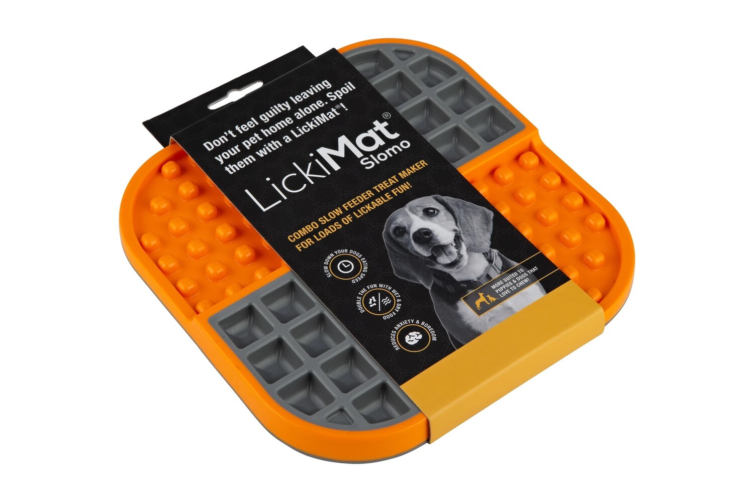 Lízacia plastová podložka Lickimat Slomo, alebo inak slow-feed miska, je rozdelená do štyroch sektorov o rozmeroch 10 x 10 cm. Dva protiľahlé sektory majú vždy rovnaký reliéf. Použité sú dva typy reliéfu – vystúpený a vydutý. Každý sektor môžete naplniť iným druhom pochúťky. Je odporúčaná veterinármi a odborníkmi na správanie psov naprieč celým svetom. LickiMat podložky sú vytvorené s cieľom obohatiť welfare psov a tým zlepšiť ich sústredenie a celkový zdravotný stav. LickiMat tiež zaistí zábavu a zmierni stres u psa, ktorý má sklony k separačnej úzkosti, keď odchádzate z domu. Pomôže tiež v stresujúcich situáciách - napríklad počas búrky alebo dlhého čakania na veterinárne ošetrenie. Rovnako tak bude užitočná pri pobyte psa v klietke. Alebo ju môžete použiť ako dlhotrvajúcu odmenu po pretekoch alebo náročnom výkone. Svoju neoceniteľnú prácu tiež odvedie v prípade psa po operácii, ktorému tak nemôžete dopriať bežnú zábavu vonku. To všetko je pre psa spojené s príjemným zážitkom, kedy si vylizuje mäkkú pochúťku zo všetkých záhybov podložky. Jemné lízanie uvoľňuje endorfíny, ktoré pôsobia upokojujúcim dojmom. Nespornou výhodou je aj to, že psovi umožníte dlhší príjemný zážitok s jedlom, napriek tomu, že použijete pomerne malé množstvo jedla. A navyše k tomu všetkému lízanie podporuje tvorbu slín, čo napomáha čisteniu zubov, ďasien a jazyka.