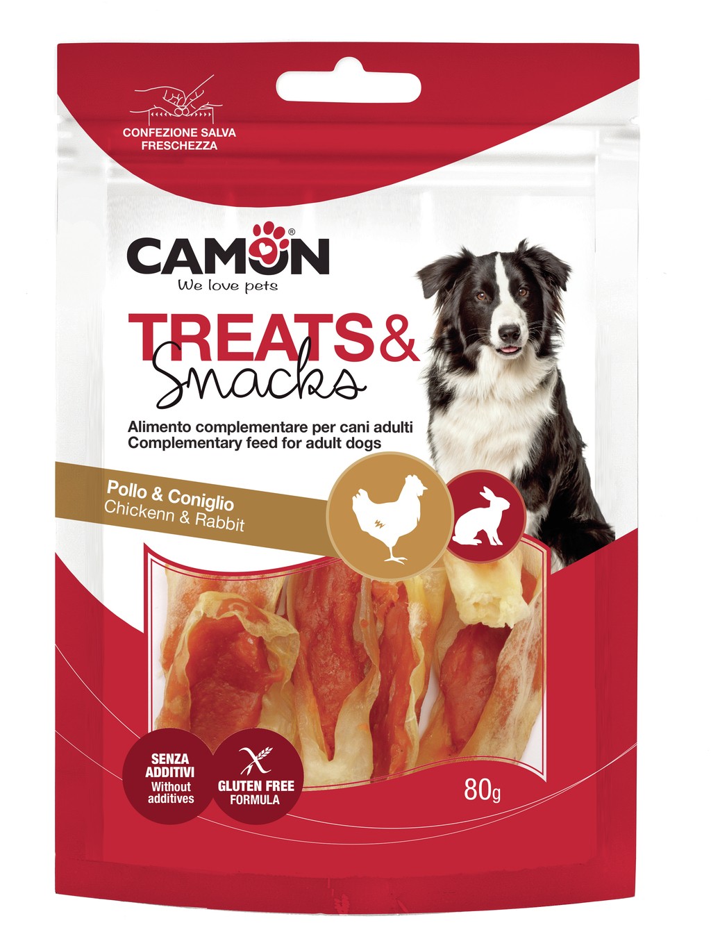 Camon Treats&Snacks Králičie uši s kuracím mäsom-doplnkové krmivo pre dospelých psov.