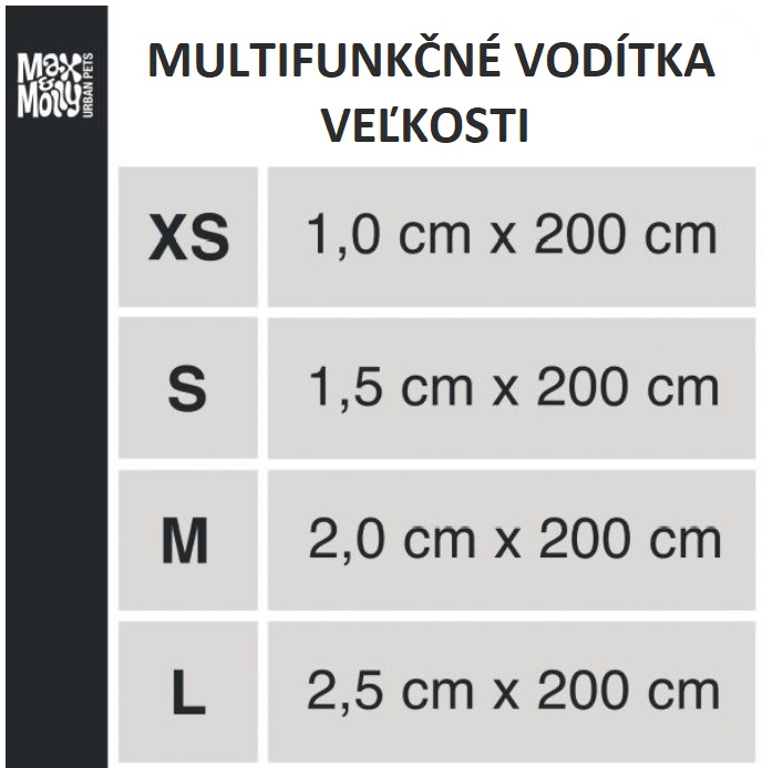 Rozmery pre veľkosť M: 2CM X 200CM Vyrobené: V Číne. Navrhnuté: Max&Molly Urban Pets GmbH, Langberger Weg 14, 24941 Flensburg, email: contact@max-molly.com, www.max-molly.com. Dovozca: 4 Laby s.r.o. Vrakunská 39 821 06, Bratislava, Email: ahoj@doxbox.sk, www.doxbox.sk