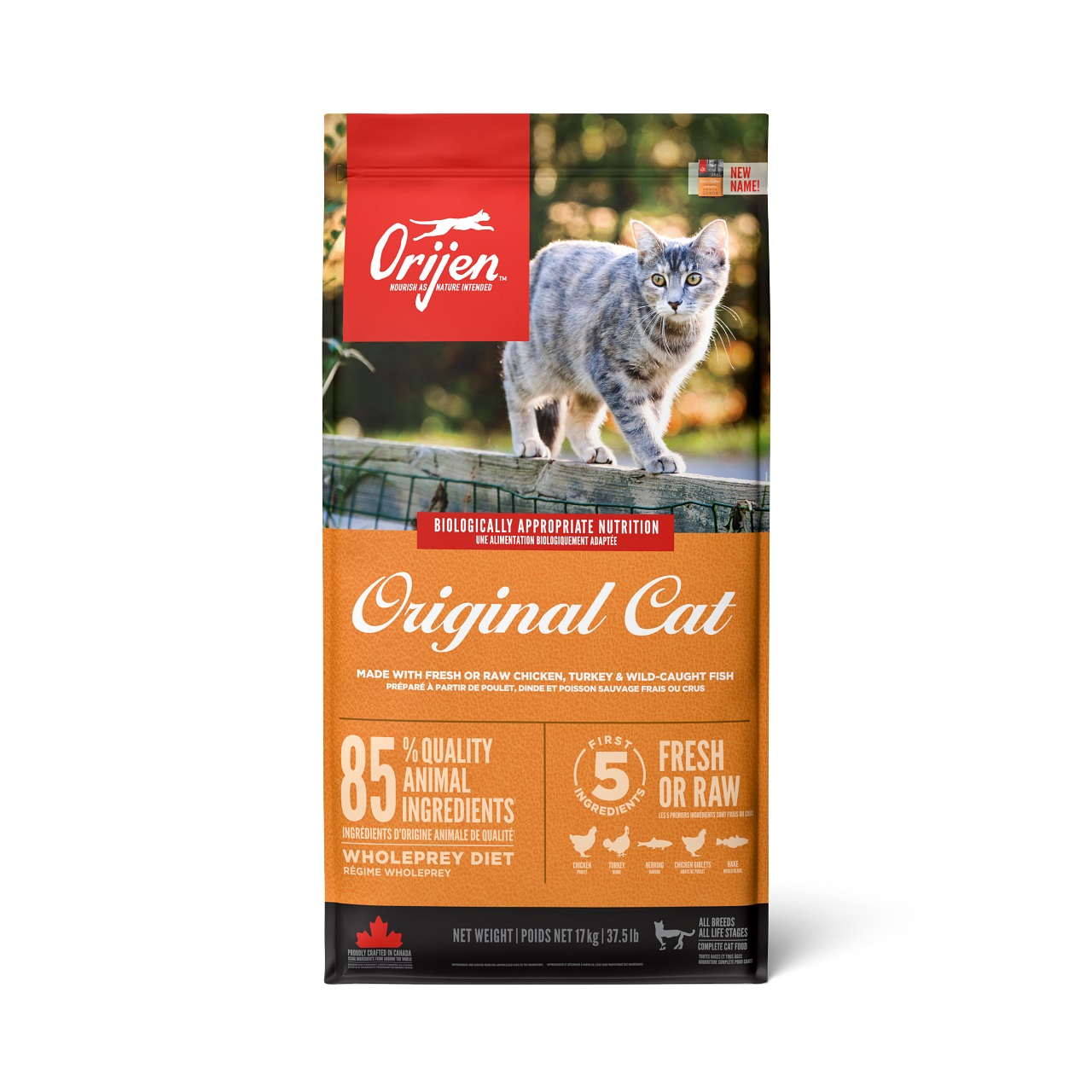 ORIJEN ORIGINAL CAT je kompletné krmivo pre dospelé mačky všetkých plemien. Obsahuje mäso z voľne chovaných kurčiat, moriek a voľne lovených rýb. Kvalitné živočíšne proteíny a omega 3 prispievajú k výbornej kondícii mačky. 85 % MASA . Krmivo je bezobilninové.
