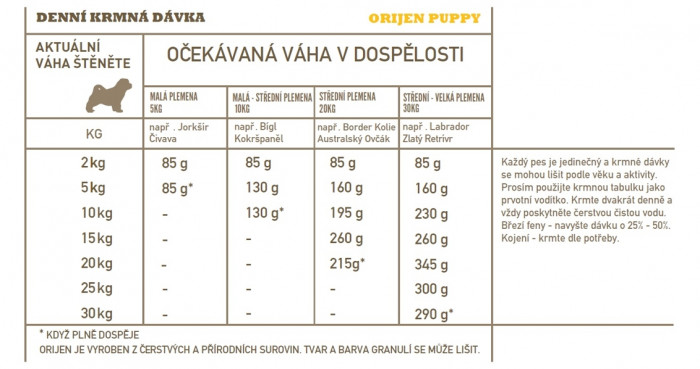 ORIJEN PUPPY je kompletné krmivo pre šteňatá stredných plemien. Obsahuje vysoký podiel proteínov z voľne chovaných kurčiat a moriek, rýb lovených v prírodných vodách a vajec z hniezdových chovov, to všetko je nám dodávané čerstvé v bohatom výživnom podiele Celej koristi. Plné živín, ktoré podporujú vrcholovú kondíciu a správny vývoj, zaručia, že váš pes bude zdravý, spokojný a silný. Receptúra je úplne bez obilnín.