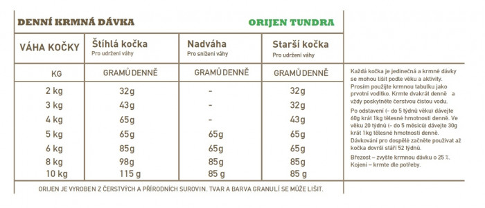 ORIJEN TUNDRA CAT je kompletné krmivo pre mačky všetkých plemien a všetky vekové kategórie. Obsahuje mäso kačacie, divinové, jahňacie, baranie, kozie a voľne lovených rýb. Kvalitné živočíšne proteíny a omega 3 prispievajú k výbornej kondícii mačky. 85 % MASA . Krmivo je bezobilninové.