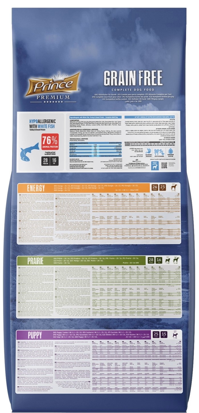 biela ryba a morka 38% (dehydrovaná biela ryba 16%, čerstvá biela ryba 14%, morka 8% ), sušené sladké zemiaky (17,5%), sušený hrach, sušené zemiaky, morčací tuk (9%), sušená repná dužina, hydrolyzované hydinové bielkoviny, minerálne látky, ľanové semienko (0,5%), zmes bylín (mäta, kurkuma, šalvia, harmanček, petržlen)